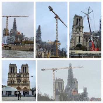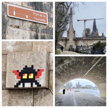 (clockwise from lower right) From Pont de Austerlitz we could see Notre-Dame in the distance on Île de la Cité; Notre-Dame from Parvis Notre-Dame – Place Jean-Paul II; A lady in mink on the quay just beyond one of the arches of le Pont de la Tournelle with Notre-Dame beyond; detail of a ceramic tile tag on le Pont; the name; approaching le Pont with the new spire of Notre-Dame and one of the cranes engaged in erecting it; three more views of the ongoing construction.