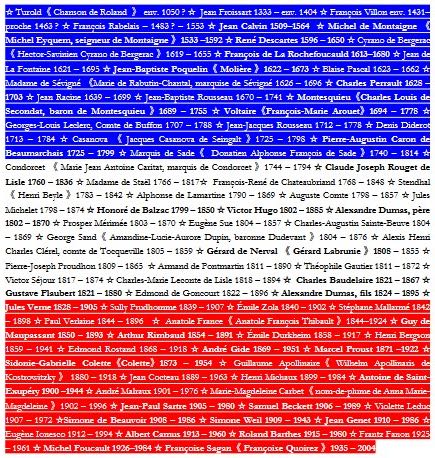 This is my panthéon of my French literary “heroes” and “heroines”, the authors whom I consider to be the best in the history of French literature. It is personal and quite arbitrary. I have selected them from a very long list beginning with Turold, the author of Le Chanson de Roland (considered the beginning of French literature written around 1066 and celebrating the victory of the French army at the Battle of Roncevaux Pass in 778 CE over the Moors, although there remains some doubt that Turold was actually its author) and ends with Françoise (Quoirez) Sagan, the author of Bonjour Tristesse (Hello Sadness) only because she was born the same year as me, and I can recall reading it in the English translation while in college – for fun. The authors in boldface are the ones I’ve actually read, at least in part, and for some, their entire oeuvre. The others, while I have not read them (yet) are ones that have had an effect on French, and in some cases world, culture and literature. I gleaned these “heroes” and “heroines” of mine from a very much longer list, and acknowledge there are many who have come since Françoise (Quoirez)Sagan, but in order to create the Tricolore graphic (above) I wanted, I applied these criteria.
