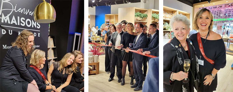 When we were in La Grande Motte for la fête du quatorze juillet (Bastille Day) we met Marjorie when she was maitresse d’hôtel at Entre Terre et Mer, but now she has a new position as the manager of Maisons du Monde at their newly renovated store in Polygone. Here she is with her staff, at the ribbon cuƫting and with Bonny at the grand re-opening; the store, completely themed for the holidays with lots of gift ideas and home furnishings.