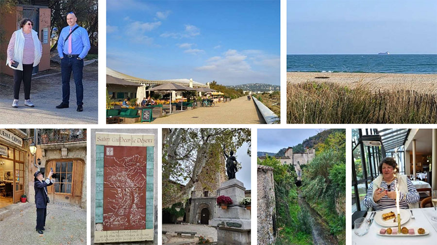 L’EssenƟel on Promenade du Lido in Sete, where we had lunch – the Mediterranean from L’Essentiel – in Saint-Guilume-le-Desert, Bonny photographing, map, fountain, Place de la Liberté, a view – Susan’s surprise at Le Petit Jardin.