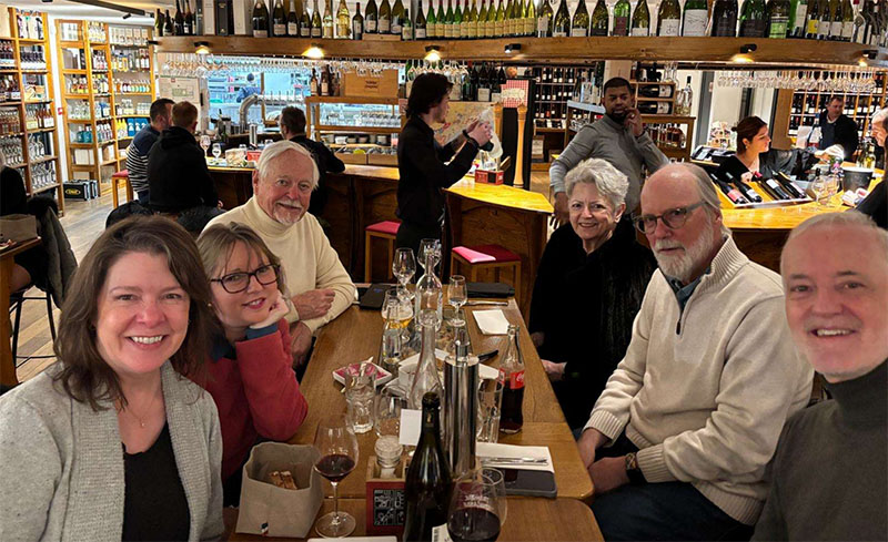 A night out on the town with friends at Trinque Fougasse Ouest (roughly translated: “Toasted Focaccia West”) one of several Trinque Fougasse wine bars in the Montpellier area, all of them featuring an amazing selection of wine (obvious from the background in the picture above) and this particular one has live music. This night we went to hear The Swing Doctors featuring Arthur Fell, piano, and Dr. David Cross, brass (trumpet, cornet, flügelhorn) with others playing jazz from the American Songbook.