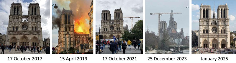 Like many of you who had been to Paris, one of our first sights to see was Notre-Dame, and its image, along with the Arc de Triomphe, and le Tour Eiffel, always evoke my “City of Light” memories; so when that fire appeared on our screens on 15 April 2019 it was an emotional shock. Since that day whenever we visited Paris we checked on the progress of her restoration. Now that her restoration is complete, on 15 February we are headed for Paris with reservations to tour her with an audio guide on our cellphones. The picture on the right above (and of the fire on 15 April 2019) are from the Internet; the others are mine.