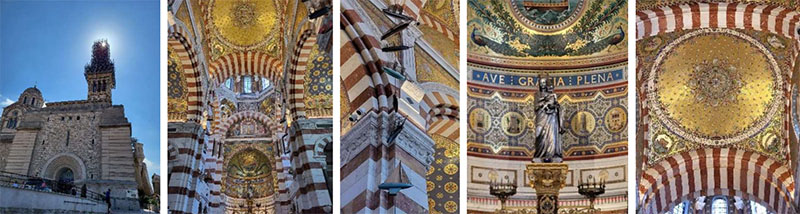 The re-gilding will be completed this October. The basilica was designed in Romano-Byzantine style by architect Leon Vaudoyer, who commissioned 23 year-old Henri-Jacques Espérandieu to prepare plans and oversee construction. The interior mosaics are dazzling; and the ship models (center image) are suspended in every arch in the nave.