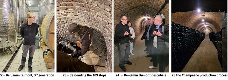 The grandson of Daniel Dumont who founded this maison, Benjamin Dumont, began our tour in the room where his grapes begin their evolution from juice into wine, and from there into the second fermentation that produces the bubbles that makes Champagne arguably France’s most sought-after beverage, and synonymous with gaiety and victory throughout the world. It is a meticulous process that require 15 months in these caves that were made in the 1870s. The limestone removed to make them was used to level the railroad right-of-way between here and Reims.