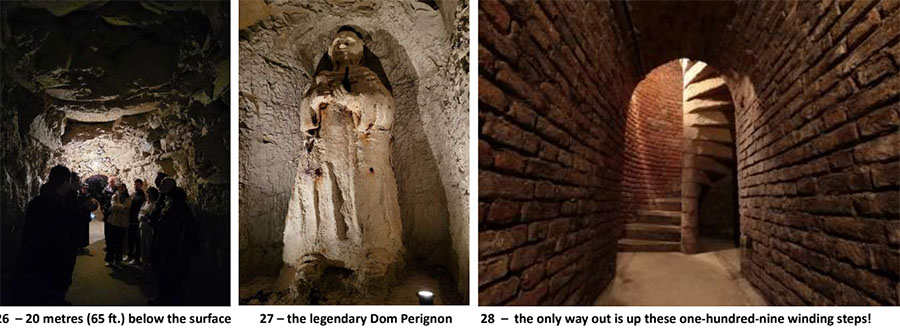 Contrary to legend, Dom Perignon did not invent Champagne. He is credited with having brought the process, known today as methode champenoise*, from Limoux in southwestern France to the Champagne region, but no one really knows. Champagne as we know it today was the work of the veuve (widow) Clicquot. At Daniel Dumont only their Champagne gets to descend and ascend by ascenseur – mortals must use this helical stone staircase’s 109 steps!